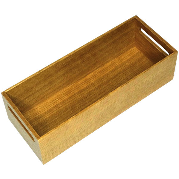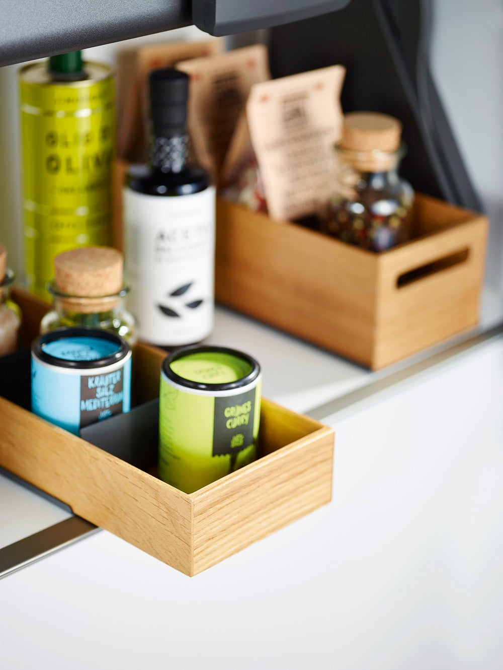 Den höga förvaringslådan i trä passar för exempelvis förvaring av torrvaror. Genom att lägga till snygga gråa avdelare i metall i lådan får du ordning på kryddor eller andra småprylar.