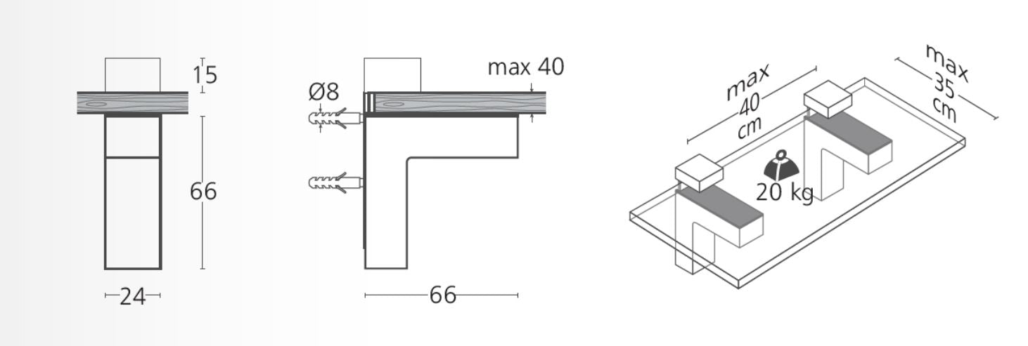 Stödet passar till 3–40 mm tjocka, max. 400 mm långa och 350 mm djupa hyllskivor. Maximibelastningen på skivan med två stöd är 20 kg.