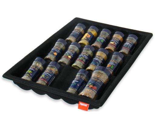Kryddfack av stadig svart filt för att hålla ordning på kryddorna i kökslådan. Bredd 313 mm, djup 473 mm och höjd 55 mm. Besticklådorna i filt kan inom ramen för lådans bredd kombineras på olika sätt.