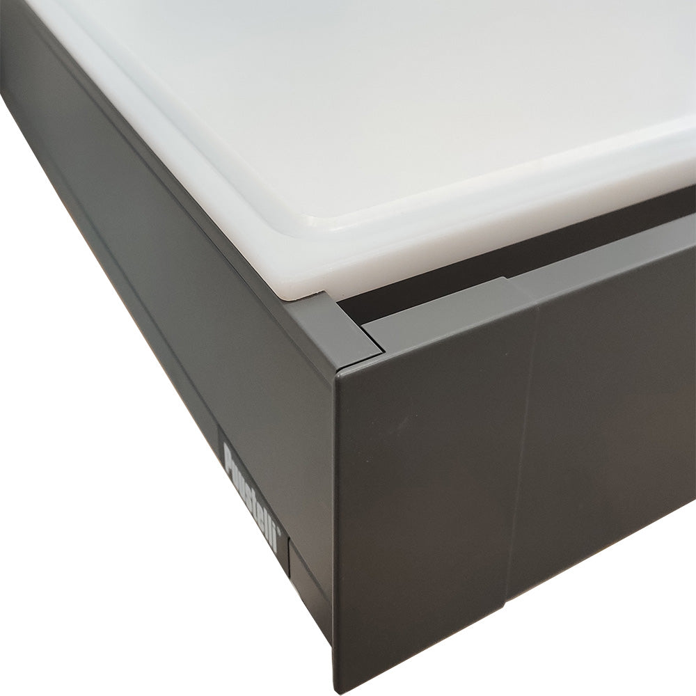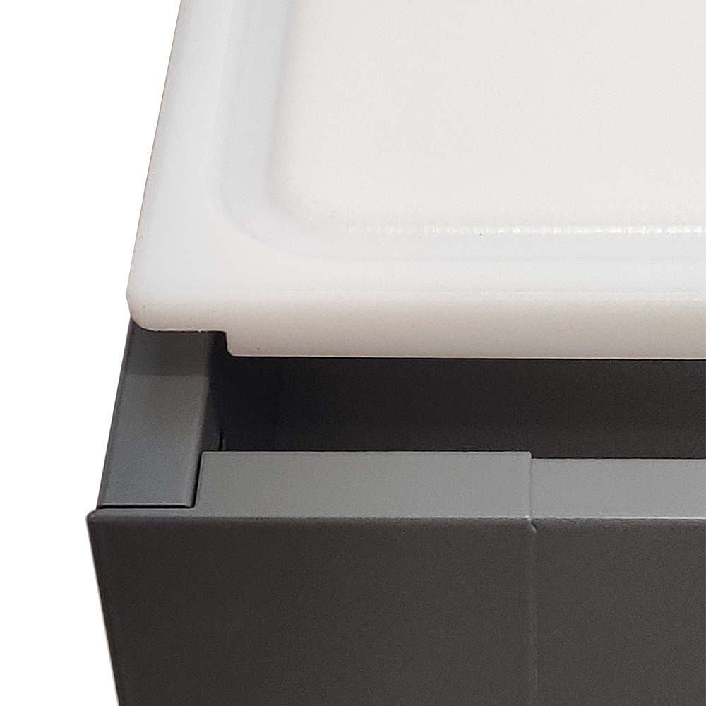 Löstagbar skärbräda som placeras på låda eller arbetsbänk. Av livsmedelsplast.